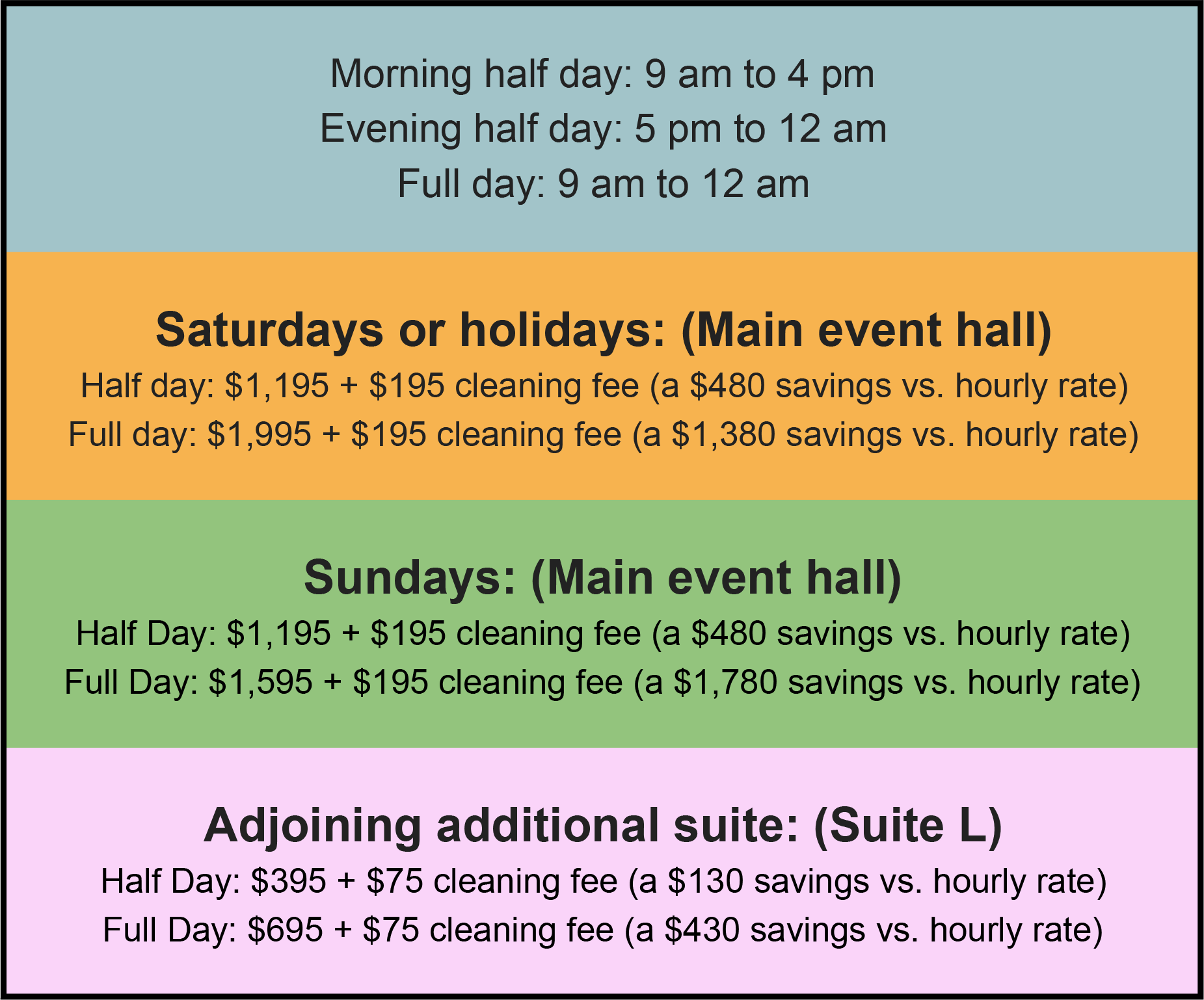 Studio sizes: Main Event Hall (1800sqft), Suite L (600 sqft)